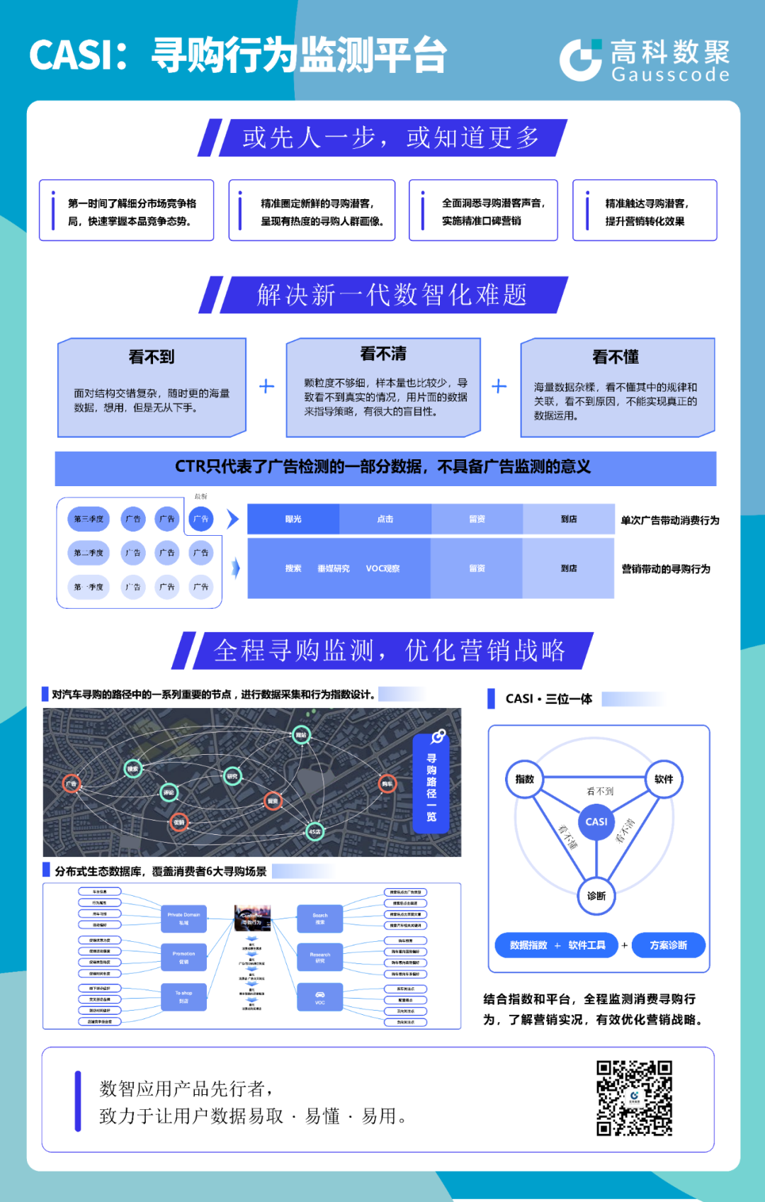 消费者寻购行为监测指数平台CASI ,将消费者在寻车、比车、研究、到店、试驾、促销等一系列洞察消费者行为的重要场景和节点进行数据分析指数化,加以高级分析模型及算法,灵活组合各项行为指标,科学、客观的反应综合营销效应,不再依赖单一指标评估营销动作。